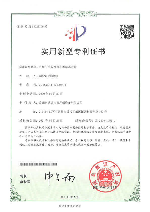 防凍裝置專利證書